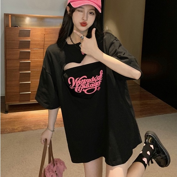 【飯團原創】愛心 長版上衣 短袖上衣 oversize 韓版上衣 抹胸 辣妹上衣 ins風 寬鬆 顯瘦 女生上衣 純棉