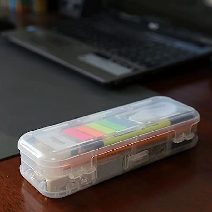 ALL IN ONE OFFICE KIT: you will find all the common office supplies from this little box, includs Binder Clips*12, Sharpener*1, Paper Clip*80, Stapler*1, Staples*1000, Rubber Band*12, Eraser*1, Clear Push Pin*18, Letter Opener*1, Page Marker*5, Steel Ruler*1, Pencil*2, Highlighter*1, Black Pens*3, Steel Scissor*1, Clear Tape*1,Clear Pencil Box* 1