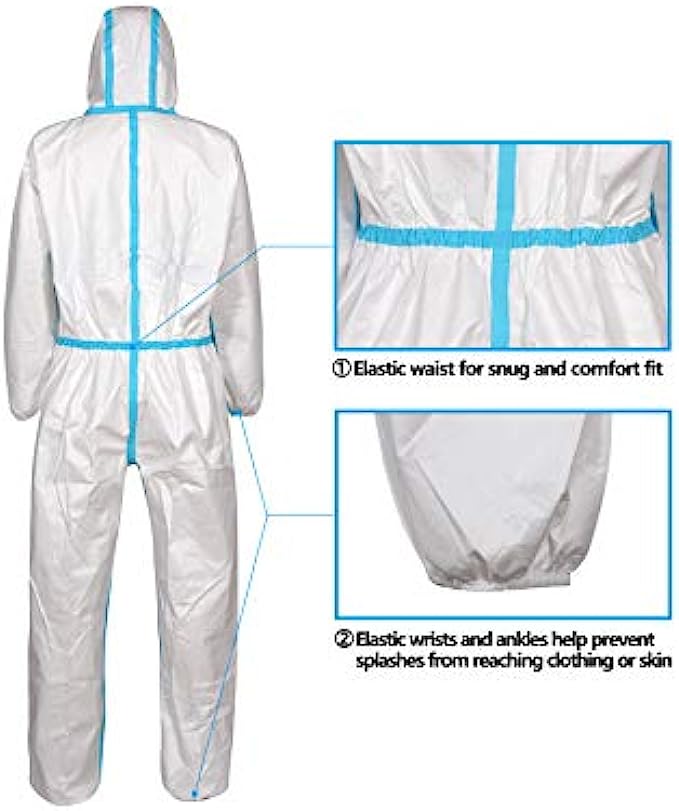 • Zipper front with protective storm flap, attached hood, elastic wrists and ankles help prevent splashes from reaching clothing or skin. Hood with elastic around face opening, designed to cover neck and chin and fit around face mask.