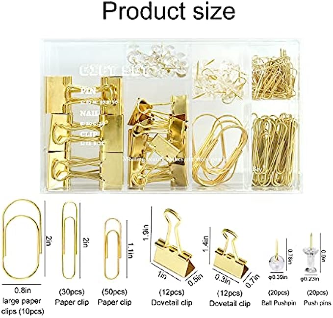 Gold Paper Clips Binder Clips, 154 PCS Luxury Gold Office Supplies Gift Set with Jumbo Paper Clips, Large Small Paper Clamps Binder Clips Clear Push Pins Office School Desk Organizer (Gold)