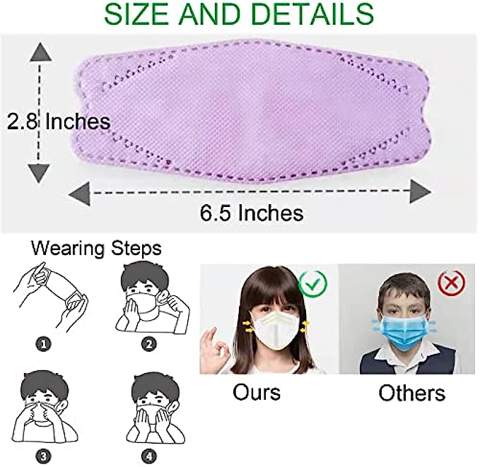 QUADRUPLE FILTRATION SYSTEM: These kids' KF94_mask features 4 layers of premium filters and, a skin-friendly inner layer to protect the respiratory system. The inner layer of our face mask is constructed using spun-bond fabric that remains soft and your kid's sensitive skin while blocking fine dust, nanoparticles, and other elements. COMFORTABLE ERGONOMIC DESIGN: lightweight breathable KF94_face mask is designed with your kids' comfort in mind. The mask U-shaped triangle solid is intended to align with the nose, chin, and ear for a comfortable fit and efficiently blocks the inhaling of the fine dust through the adhesion structure. LIGHTWEIGHT AND BREATHABLE: Presents you with a nanofiber insert kids' KF94_face mask that creates a protective layer and keeps the weight light. This premium reusable face mask will protect your kid's from inhaling harmful substances when allowing them to breathe fresh and pure air. DURABLE AND ELASTIC EAR LOOP: The cute kids' KF94_mask features a skin-friendly elastic ear band made using soft and durable material that ensures comfort. This elastic ear hook is made of a latex-free mask to reduce the pressure on your small ears, assuring prolonged wear throughout the day. EASY TO USE DISPOSABLE FACE_MASK: After wearing this face mask, press the nose pin for a comfortable and protective fit. These kids' face masks are suitable for boys and girls at home, school, parks, outdoors, and busy public places.