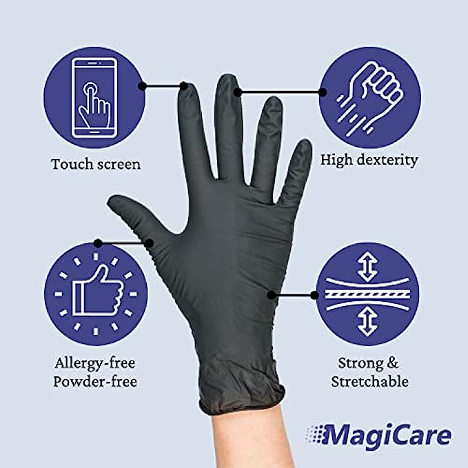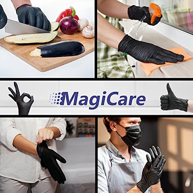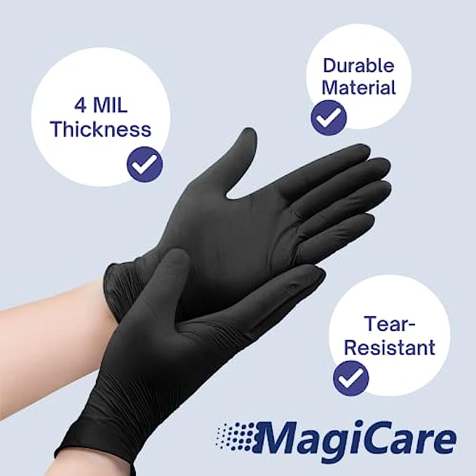 Imported ?DURABLE MATERIAL: MagiCare's tear-resistant Black Gloves are made from a strong, highly stretchable nitrile material - the best option for tear and puncture resistance. ?NON-SLIP GRIP: Allows for fine control and grip when precision is needed for lab work, first-aid, hair & skin care, tattoo design, arts & crafts, pet care, food prep, and beyond! ?FOOD SAFE: These food safe gloves are ideal for food prep and handling fruits, veggies, meat, etc. MagiCare’s Nitrile Gloves are also a great option for cleaning, at work, around the house, and much more! ?ALLERGEN-FREE: Powder and latex free for individuals with sensitive skin and allergies to natural rubber latex. ✔️4 MIL THICKNESS: Ideal thickness to not only offer all day comfort and control but have the strength to withstand heavy duty activity.