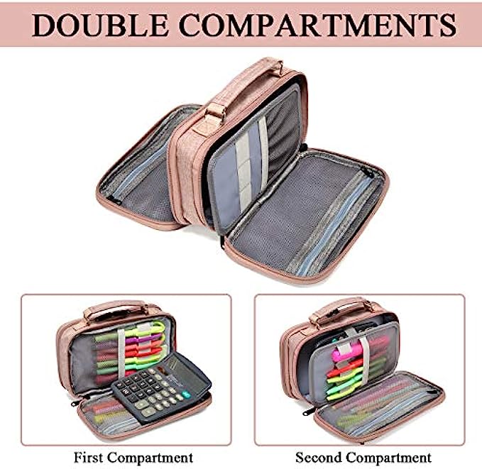 ✎EASY TO ORGANIZE:The large main compartment is ideal for pens, pencils, and markers or your phone with the elastic strap.It includes a small mesh pocket handy for erasers and other small items that might otherwise get buried. The other zipper compartment allows easy access to frequently-used items like rulers and scissors.Two mesh pockets can store other small items.The mesh pockets can keep lead, cards, and other accessories in order.