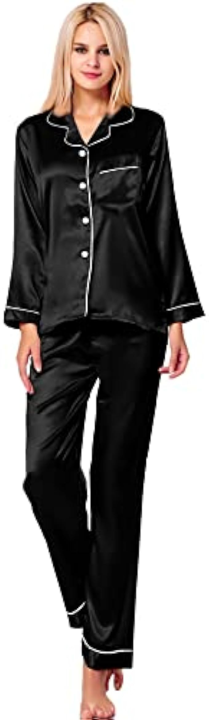 Button closure Machine Wash Materials: This lightweight pajama set is made of lightweigh silk satin, soft,breathable and skin-friendly, help you have a sound sleep. Features: The relaxed fit two-piece comfortable sleepwear pajama set features the silkiest pant with elastic waist and matches a silky-smooth long-sleeve V-neck top with a chest pocket, notch collar and the button-front top hits at hips. The sleepwear set are soft and elegant, to giving you a lazy sleep. Occasion: Women's Long Sleeve Silk Satin Pajamas Set, which is suitable for daily wearing and easy to match. Comfortable and suitable for lounging and sleeping, pajama party, girls day, bridal sleepwear, indoor, living room, bedroom, hotel, vacation, travel, and daily sleepwear. Gift: Women's silk pajamas for women is made of high quality imitation silk fabric, it is soft and natural shiny. Great Choice For your Wife, Girlfriend, Mother, Sister and Doughter as a Birthday gift and Great Present for New Year, Valentine's Day, Christmas Day, Bridal Party Gifts, Honeymoon Vacation or other Festivals or Anniversaries. Washing Tips: Machine Washable, Hand Washed Suggestion.