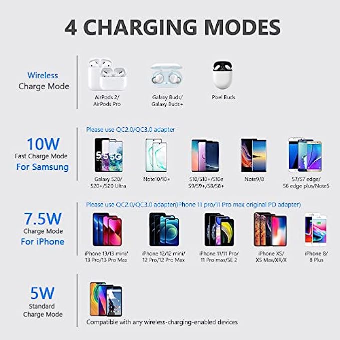 • 【3 Charging modes Available for Different Phones】7.5W charging mode is for iPhone 13/13 Pro/13 Mini/13 Pro Max/12/SE 2020/11/XS/XR/X/8 with latest iOS System; 10W charging mode is compatible with S22/S22 Ultra/S21/S20/Note 10/S10/S10E and so on; 5W charging mode works on Any wireless-charging-enabled devices like Google Pixel 3/3XL/4XL and other wireless-charging-enabled phones. Note: Adapter is Not Included, QC 2.0/3.0 adapter will be highly recommended.