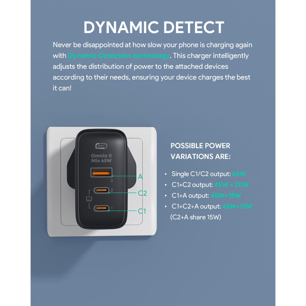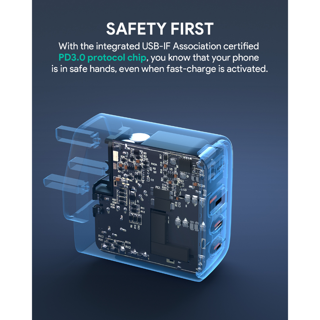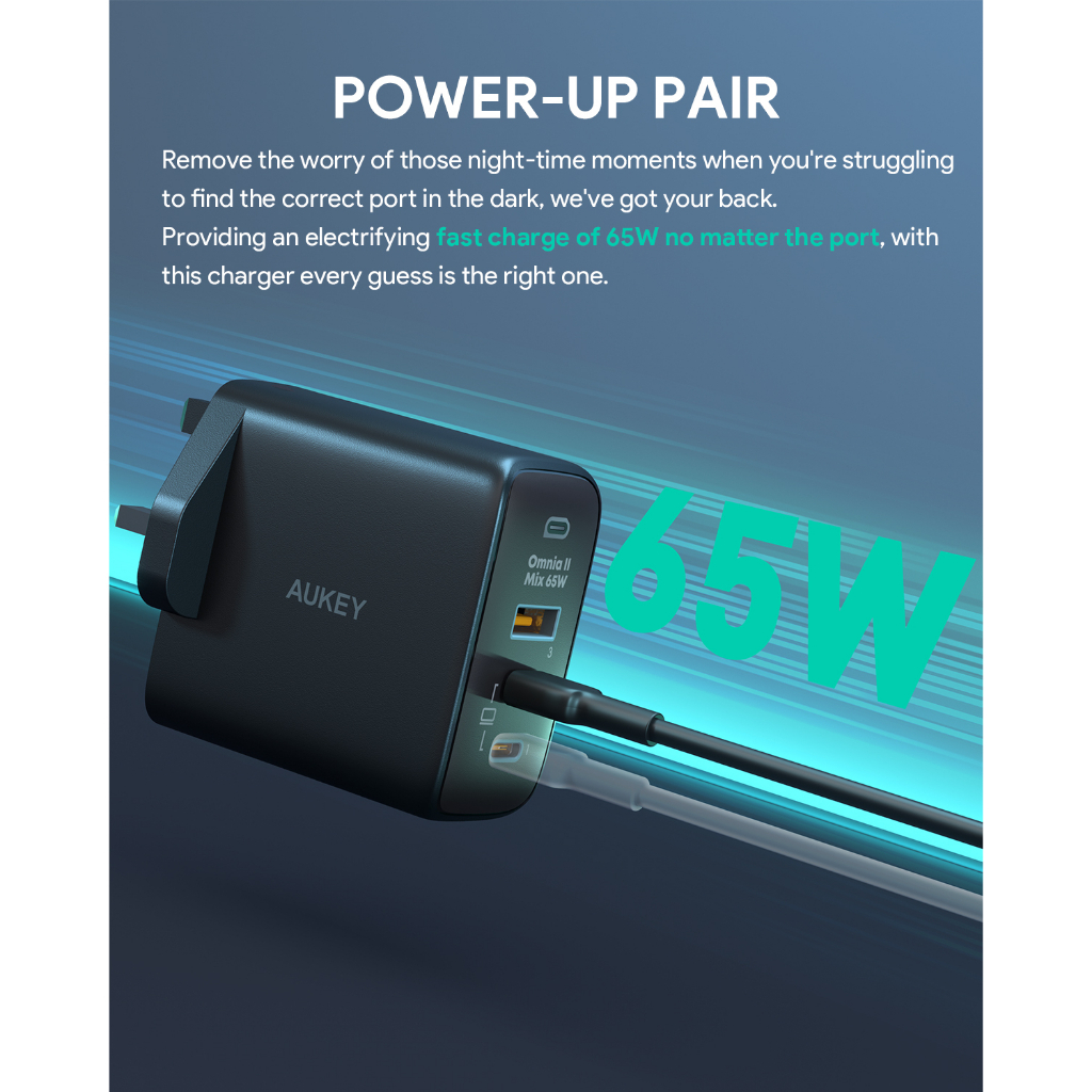 Aukey PA-B6T Omnia II 3-Port 65w PD & Super Fast Charging (PPS) Wall Charger w GaN Power Technology (24 Months Warranty)