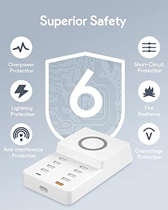Smart Fast Charging - Charging Station Manager contains 8 12W USB ports, 1 20WPD port and 1 20WQC port and 1 10W wireless charging. The adaptive smart chip detects and provides the optimal charging current to the connected device to reduce charging time.