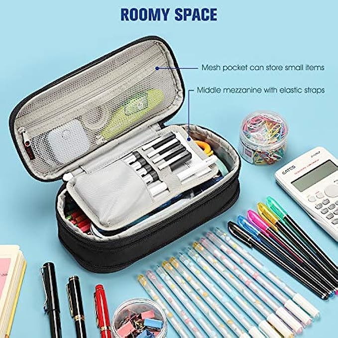 UNIQUE DESIGNS: Comes with a removable hand strap. Zippered mesh pocket can store small stationeries, such as erasers, sticky notes, rubber, sticker, etc. The middle mezzanine with elastic straps can protect frequently-used pens/pencils.