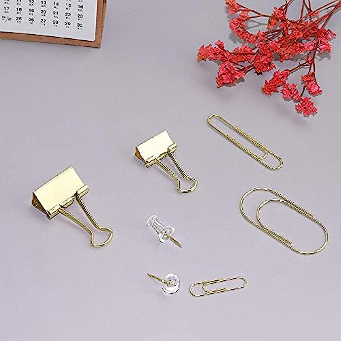 Gold Paper Clips Binder Clips, 154 PCS Luxury Gold Office Supplies Gift Set with Jumbo Paper Clips, Large Small Paper Clamps Binder Clips Clear Push Pins Office School Desk Organizer (Gold)