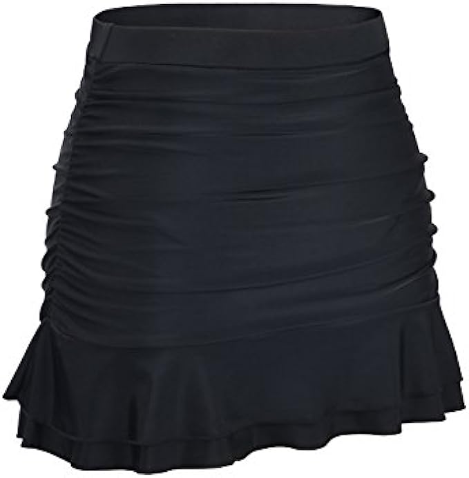 80% Nylon, 20% Spandex Imported OUR SIZE SUGGESTION:The Swim Skirt fits true to size now, please refer to the size you normally wear. For example:If you are US 4, please order size 4, you will receive the swim skirt Tag US 8 which fit for US 4 (We make the adjustment). Swim skirt features built in swim pants and an elastic waistline for a flattering fit. Ruched front design and flat in back, so it can slim your tummy and flatter feminine curves. High waisted swim skirt for concealing tummy better; Double ruffle hemline. Built-in mesh brief increases comfort and support.