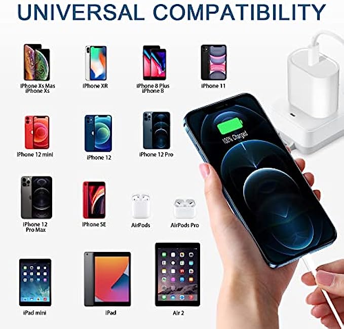 【Universal Compatibility】 The 20W PD phone chargers for iphone can fast charge iPhone 12/12 pro/12 pro max/12 mini/11/11 Pro/11 Pro Max/XR/XS Max/XS/X/8 Plus/8 , iPad Pro, AirPods Pro, and charge iPhone 7/7 Plus/6s/6s Plus/6/6 Plus/SE/5s/5/5c at standard speed.