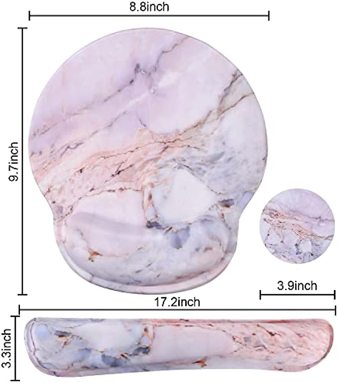 3 in 1 Set with Standard Size: The mouse pad with wrist rest measures 9.7inchx8.8inch, the keyboard wrist rest measures 17.2inchx3.3inch and the diameter of cup coaster is 3.9inch. This mouse pad set has excellent shape and size, it is suitable for office work, home, travel or other occasions.