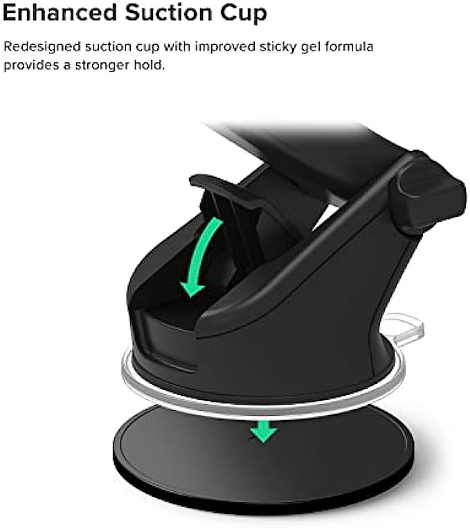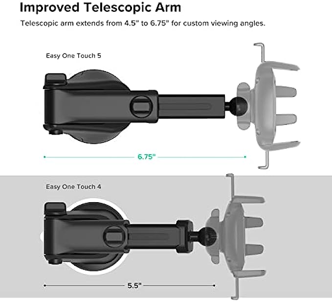EASY ONE TOUCH MECHANISM: Press the locking side arms with a quick one-handed motion, and place your phone against the trigger button. The mount’s arms will close automatically, holding your device securely while you drive. Mount or remove your phone in seconds with the patented Easy One Touch Mechanism. WIDE COMPATIBILITY: New larger Easy One Touch button, with a universal cradle that fits smartphones and cases of any size. MAGNETIC CORD ORGANIZER: Keep charging cables neatly organized with the magnetic tab located near the bottom foot TELESCOPIC ARM: The improved telescopic arm now extends from 5 inches to 8 inches (as opposed to the Easy One Touch 4 which only extended to 6.5inch) and pivots 260 degrees. This enables a myriad of customized viewing angles while you’re on the road. ADJUSTABLE BOTTOM FOOT: You can easily and securely adjust the bottom foot by squeezing the spring button.