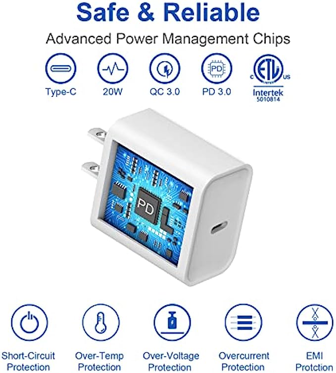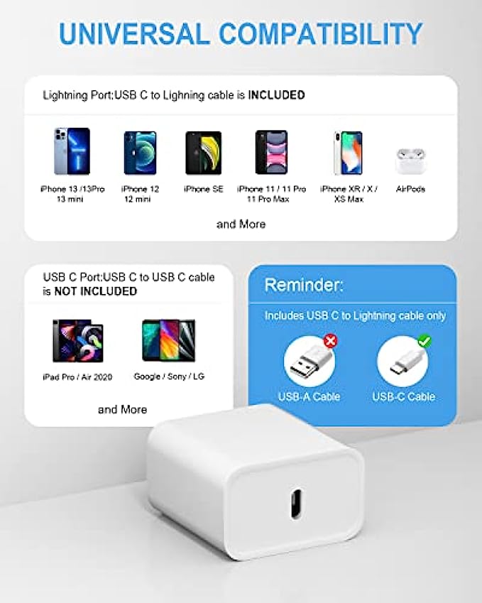 ⚡【Safe & Reliable】: This 20W PD adapter Wall chargers and USB-C lightning cable/cord FAST Charger Certified by UL, ETL, FCC, CE, ROHS.It is safe to use this PD adapter Wall charger and USB-C lightning cable/cord to charge for your iphone/ipad/airpods.You will get: 2* 20W PD 3.0 Wall FAST Charger and 2*6FT Apple MFi Certified USB C to Lightning Cable, 1-Year replacement guarantee. If you have any concerns, please do not hesitate to contact us! We promise to solve your problems within 12 Hrs!
