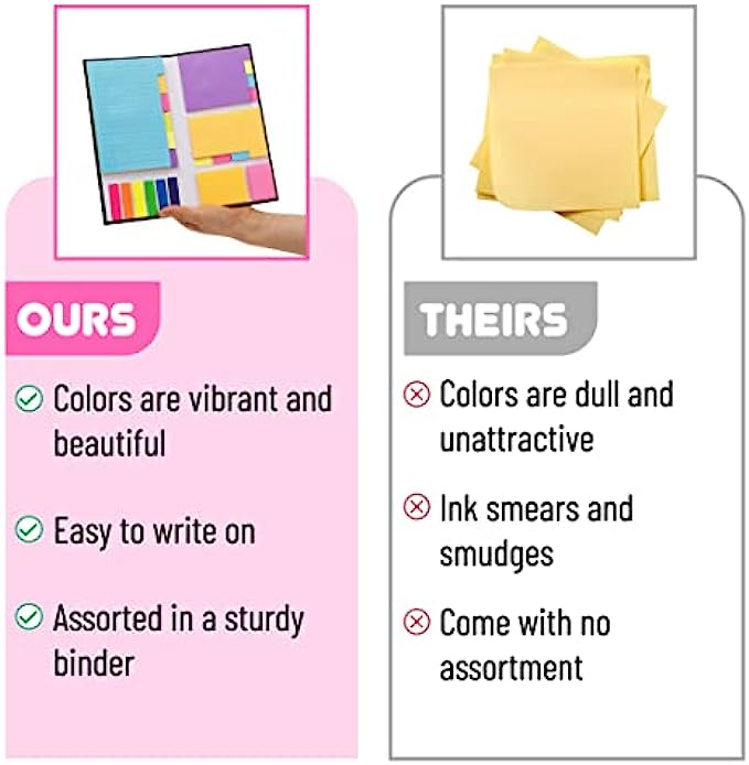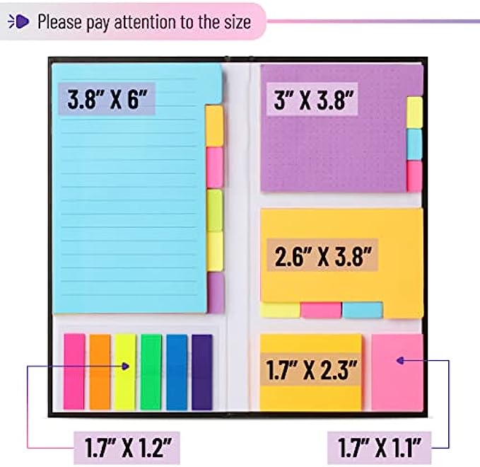• Each sticky notes set includes 60 Ruled (3.8x6’’), 40 Dotted Notes (3x3.8’’), 40 Blank (2.6x3.5’’), 60 Orange and Pink, 150 Neon Color Index Tabs, 410 Total Tab Divider Notes