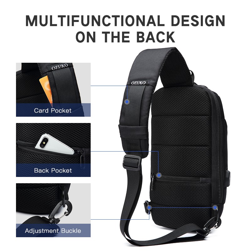 OZUKO Fashion Men Waterproof USB Charging Crossbody Bag Anti Theft Lock Sling Chest Pack