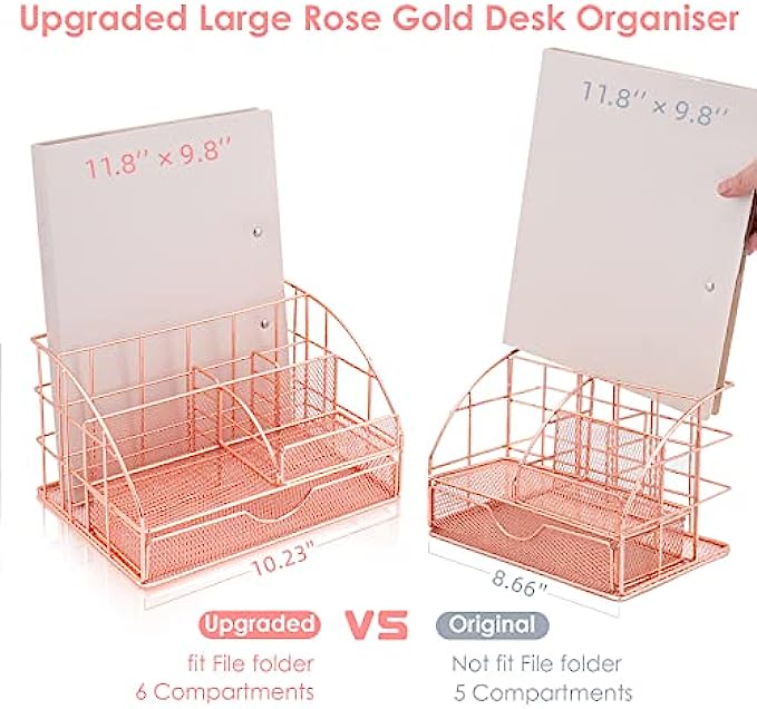 UPGRADE LARGER SIZE MORE SPACE: ARCOBIS rose gold desk organizer is larger than other similar designs on the market and has more storage space. The largest back compartment can easily hold up to 280 A4 sheets; 6 Compartments + 1 Large Drawer for important documents, pens, paper clips, pencils, scissors, and all office accessories.