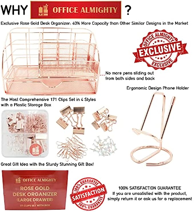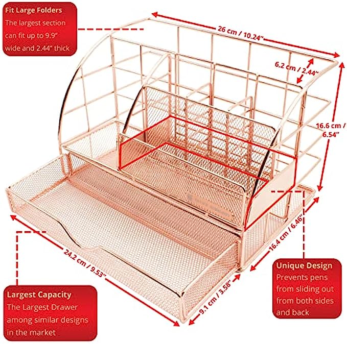 UNIQUE & STYLISH DESIGN: OFFICE ALMIGHTY Desk Organizer's Drawer and Biggest Section are larger than other similar designs in the market; its wire and mesh metal surface is coated by the Unique Surface Treatment Technology to prevent rusty and its color is fine-tuned to well-polished shiny rose gold to give the stunning spark appearance that will catch your attention from distance and elevate your mood; You will feel more elegant, noble, and peaceful and receive compliments from visitors!