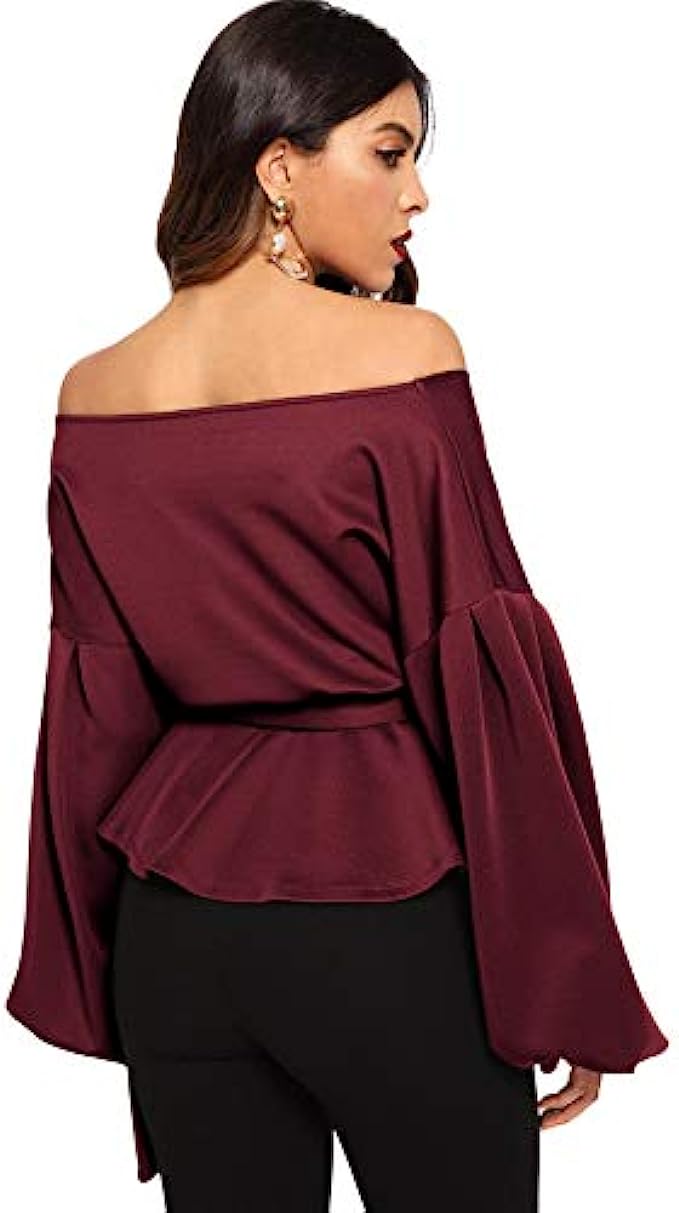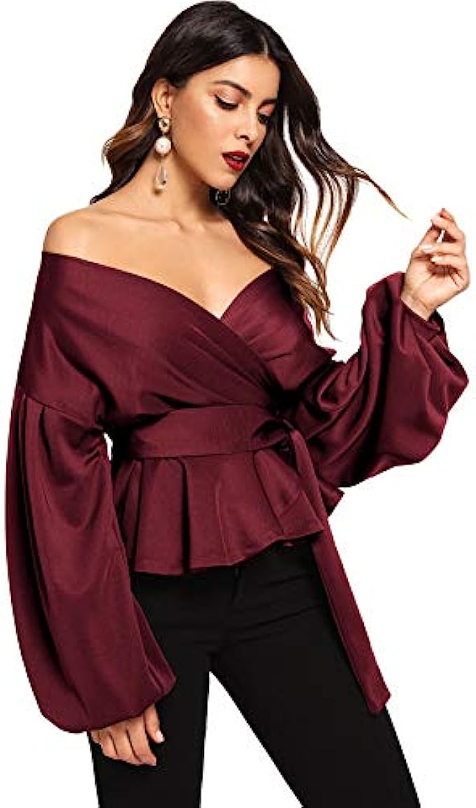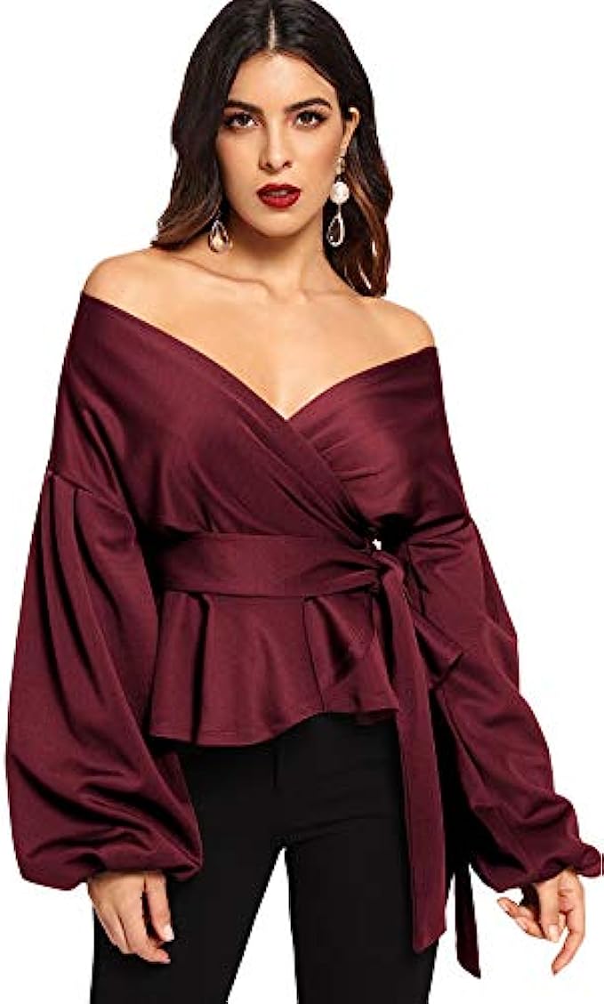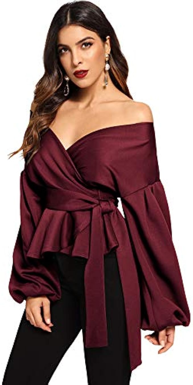 SheIn Women's Long Sleeve V Neck Ruffle Blouse Off Shoulder Tie Waist Wrap Tops