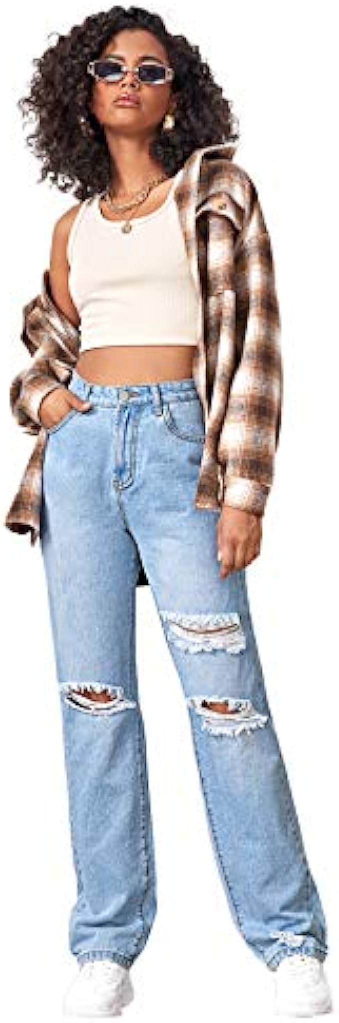 SweatyRocks Women's Ripped Straight Leg Jeans High Waist Distressed Cutout Denim Pants
