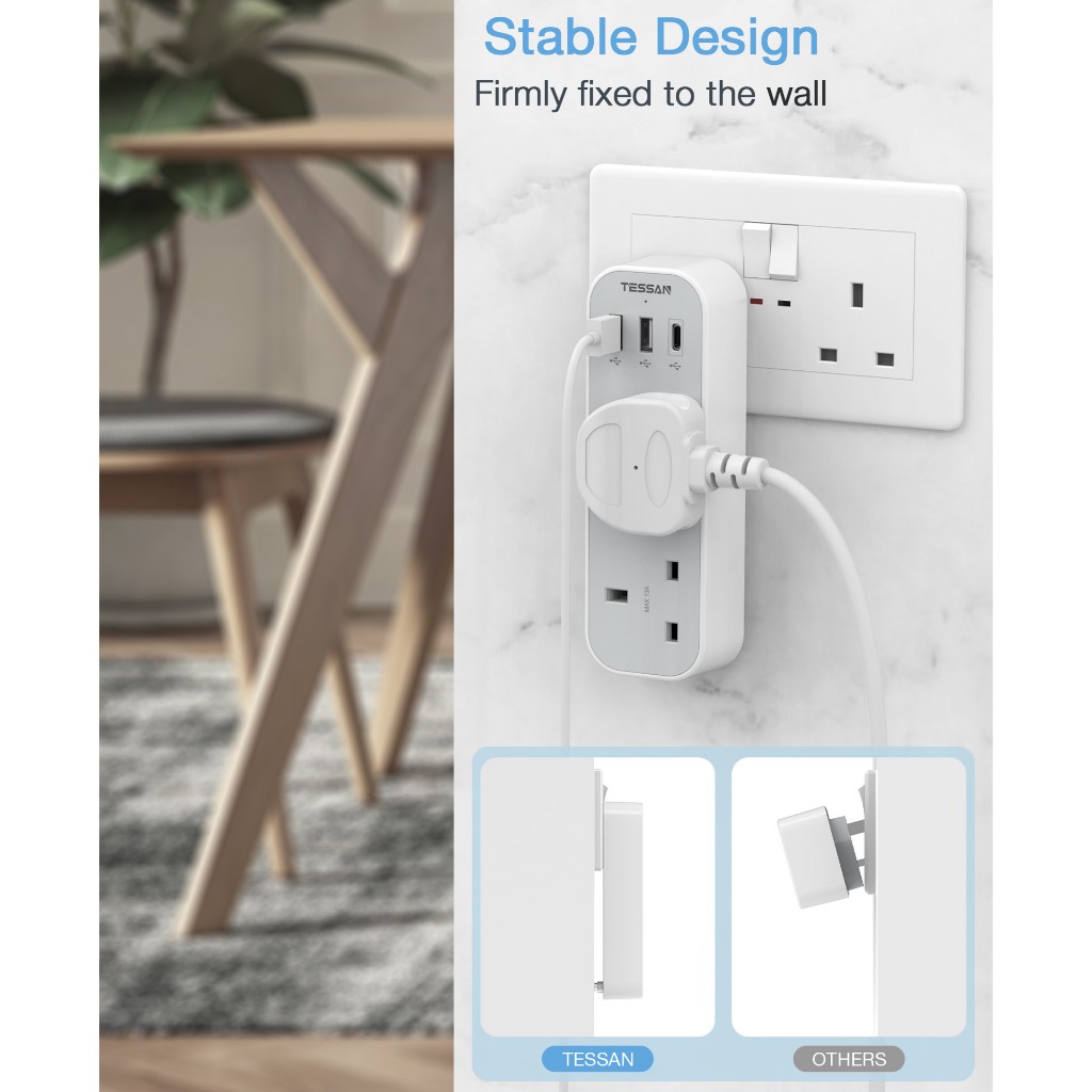 TESSAN Multi Plug Extension Adapter with USB and Type C,2 Way Power Extension Socket Wall plug