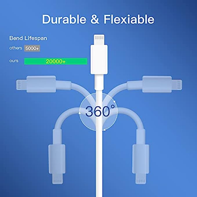 • 【Unparalleled Quality】:These super durability and flexibility and no tangles iphone usb c cables are made of top-rated material and coated with premium TPE.Built-in overvoltage protection to ensure charging safety, which last 4X longer than other iphone charger cords and proven to withstand over 20,000 bends in strict laboratory tests.
