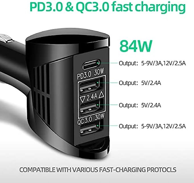 4 ports USB fast car charger output 84W(Max), PD3.0 port output 30W(Max), QC3.0 port output 30W(Max), 2.4A port output 12W(each port), each output port is independent, ensure that the output power will not decrease, ensure fast charging of each device.