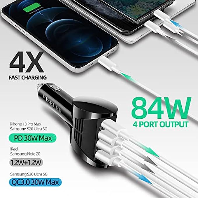VISELER USB C Car Charger Adapter 84W 10.8A, 4 Port Fast Car Charger, PD3.0 QC3.0 Car Phone Charger Fast Charging Compatible with iPhone 13 12 11 Pro Max, Samsung Galaxy S21 20/Note 20, Pixel, LG.